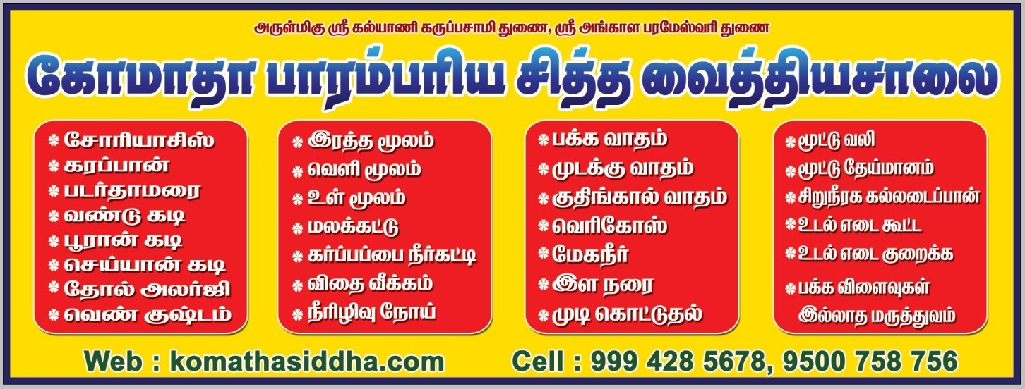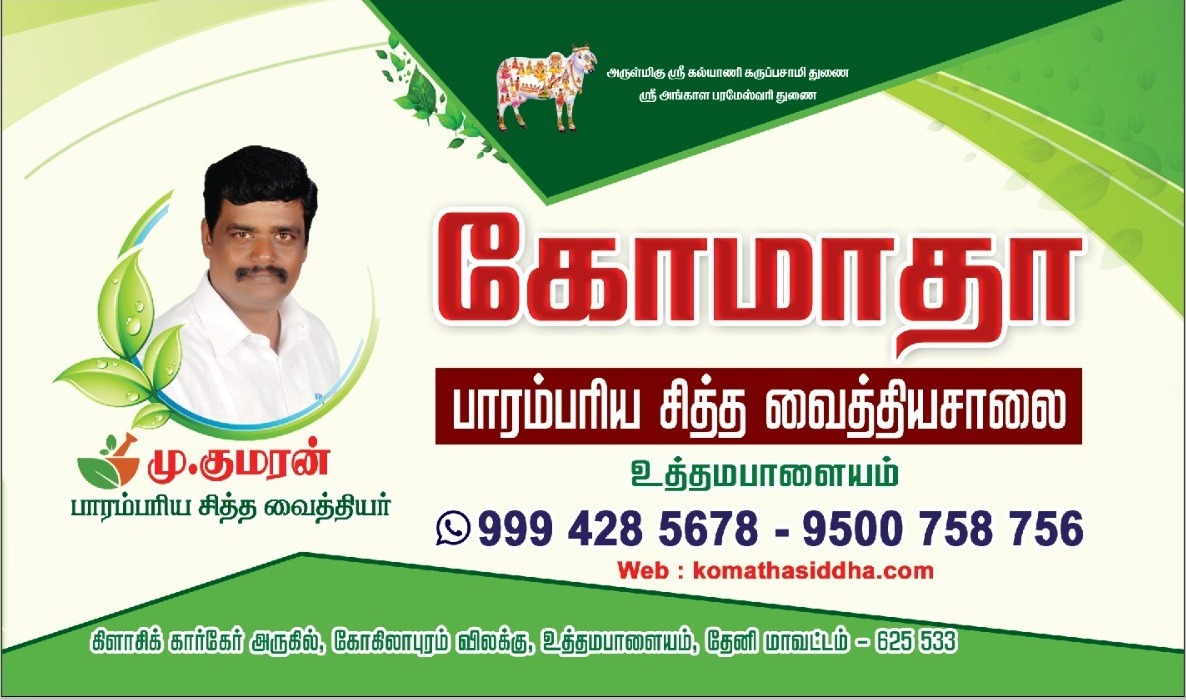 Komatha Parampariya Siddha Vaithiyasalai is promoted by Kumaran at Uthamapalayam. We work hard to provide excellent customer service to all our clients.